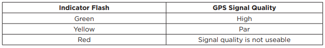 The second LED flash indicates GPS signal quality. If navigation is NOT started, the indicator will always be RED. To ensure that navigation has been started, gently shake the unit.