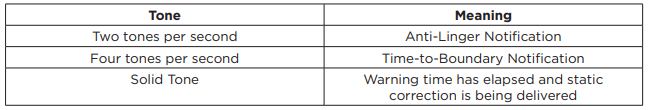 As an additional measure of protection from running through the boundary, there is less warning as the urgency of the violation increases. The length of time for a warning tone accumulates and is inherited by any subsequent violation. Accumulated warning time is discarded only when there is no current violation. Static corrections are always accompanied by a solid tone.