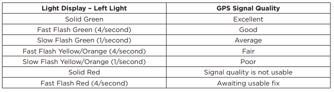 The GPS 3.0 Base Unit’s Left LED reflects GPS signal quality. See indicators below to know when action is needed.